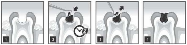 1- Isolare con rulli di cotone. 2- Applicare Brix 3000® nella cavità e attendere 2 minuti. 3- Rimuovere con movimenti a