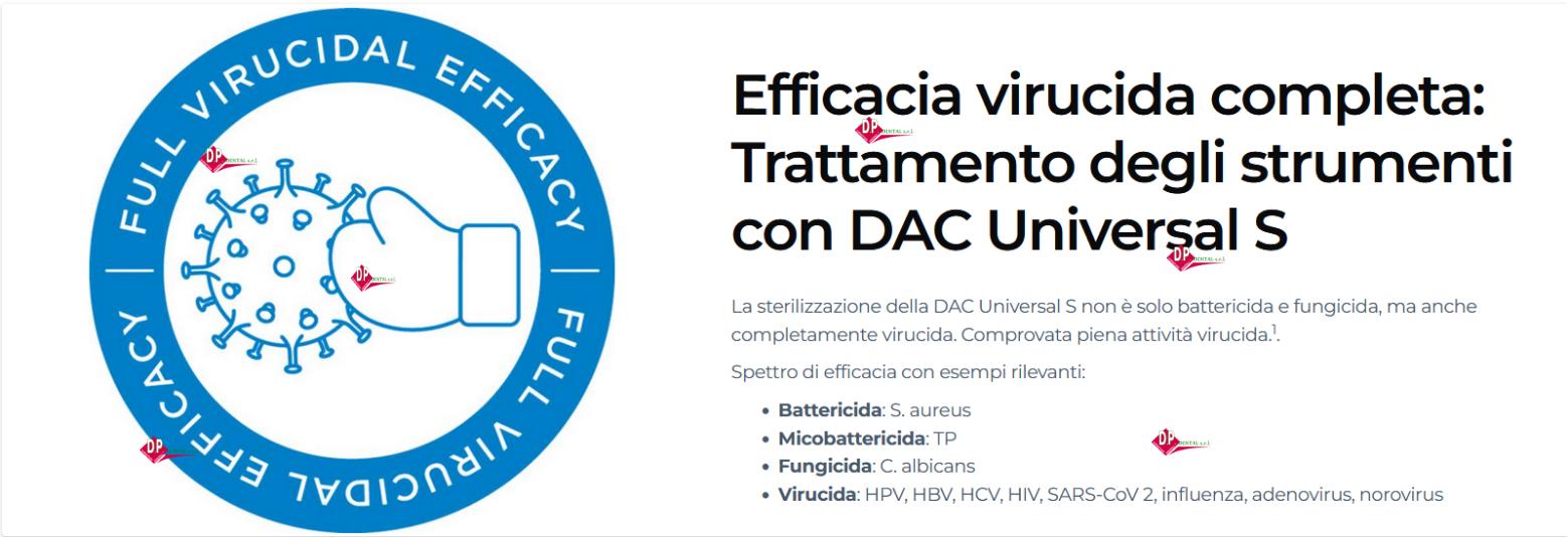 La sterilizzazione della DAC Universal S non è solo battericida e fungicida, ma anche completamente virucida. Comprovata piena attività virucida.1.